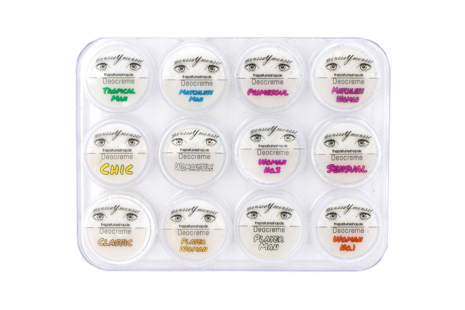 In diesem Set finden Sie 12 Proben veganer Deocremes ohne Aluminiumsalze von mousseYmousse.